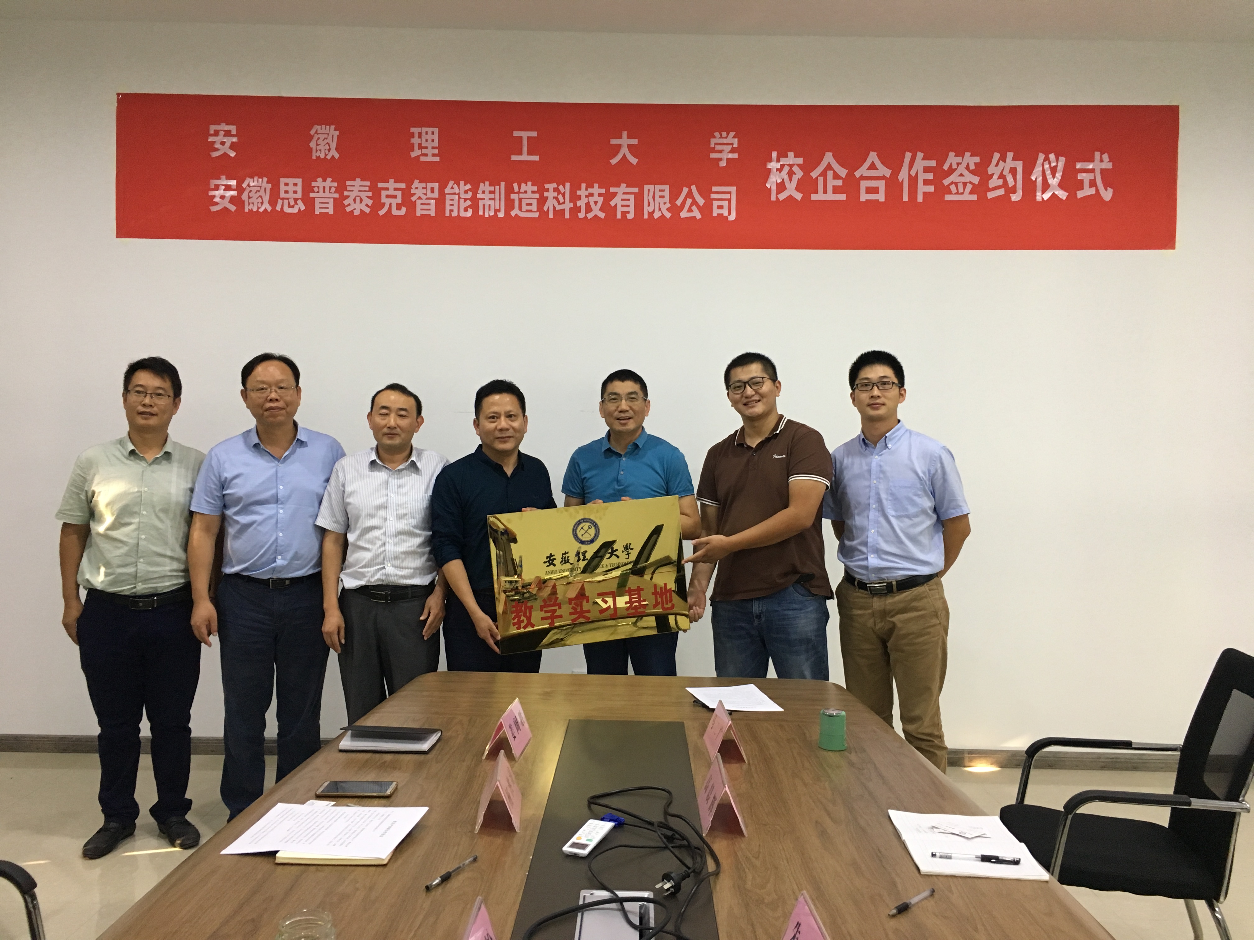 校企產學研簽約合影 2019年9月18日,在這個特殊的日子里,安徽思普泰克智能制造科技有限公司與安徽理工大學簽署產學研戰略合作協議。安徽理工大學機械工程學院副院長楊洪濤教授